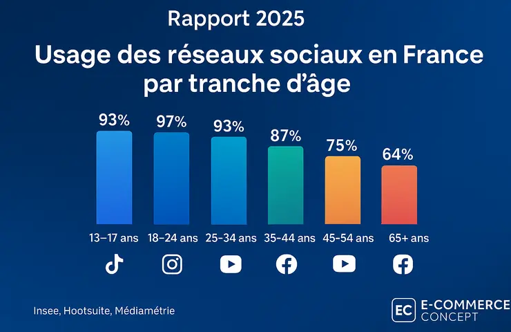 La réalité est plus nuancée. Oui : l’âge influence fortement les usages. Mais non : les clichés générationnels ne suffisent pas à bâtir une stratégie efficace. Le rapport 2025 d’E-commerce Concept sur les réseaux sociaux met justement en lumière des tendances fortes, mais aussi des chevauchements inattendus entre les générations.